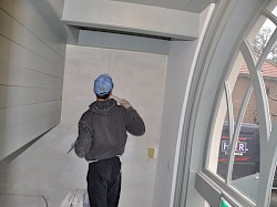 Op het begane grondniveau waren diverse schadeplekken met een lambrisering aan het oog onttrokken.Wij hebben meermaals ervaren dat bij extra vocht-en zoutbelasting in de muren het aanbrengen van een zoutbufferend pleistersysteem niet duurzaam is.Dat was dan ook de reden om in het genoemde project te zoeken naar alternatieven in overleg met het kerkbestuur en de aannemer.